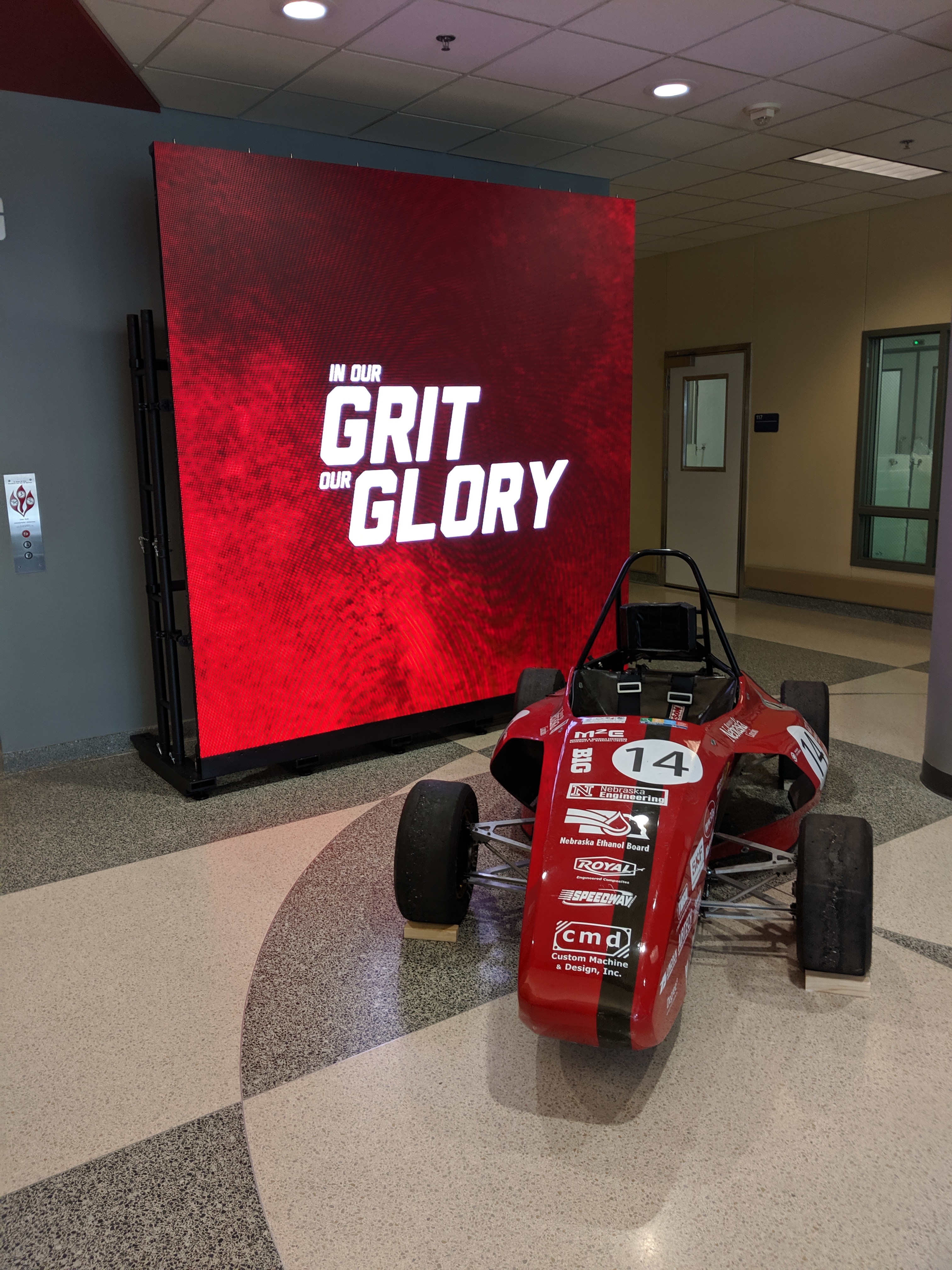 The ground support framework is temporary. The vendor received the pieces for the wall earlier in the week. By using ground support we could squeeze in the installation between NUBE and the start of the school year. The final plan for the lobby adds a platform in front of the wall to highlight the work of student clubs and our research teams. At that time the video screens will be moved back and mounted on the wall, then trimmed for a finished look.