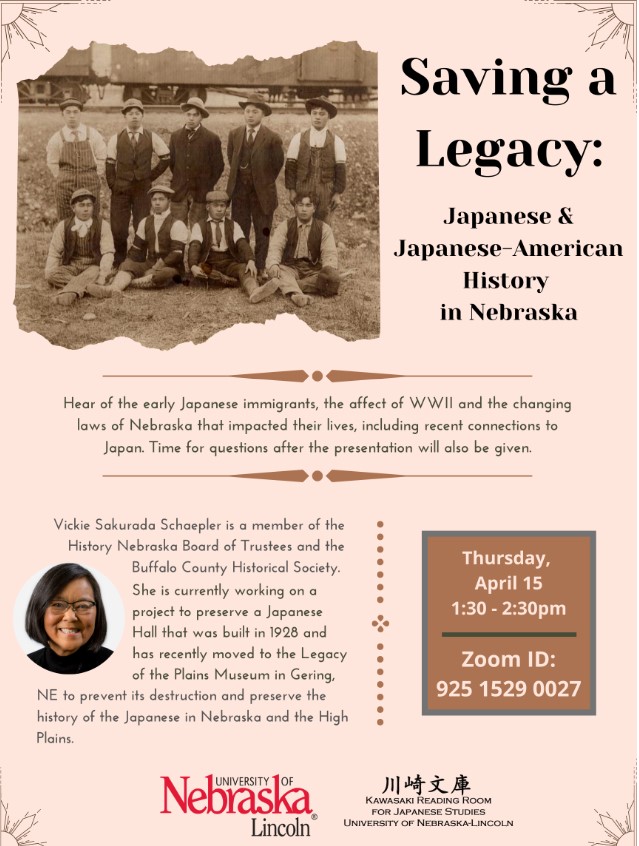 Hear of the early Japanese immigrants, the affect of WWII and the changing laws of Nebraska that impacted their lives, including recent connections to Japan.Thursday, April 15th from 1:30-2:30 with Vickie Sakurada Schaepler