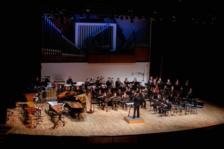 The Wind Ensemble is the university’s premier concert band. Its select mission is to provide instrumentalists of advanced technical proficiency a pre-professional ensemble experience. With an emphasis on contemporary American compositions, the Wind Ensemble’s repertoire reflects the most recent technical and textural innovations, as well as the rich tradition of wind and percussion music extending back to the Renaissance. The objectives of the Wind Ensemble are to rehearse and perform repertoire of the highest caliber, encompassing the broadest possible spectrum of styles; to develop a high degree of refinement and independence in students’ ability to communicate musically in both chamber and larger ensemble settings; and to provide, through the study of the masterworks of the wind band repertoire, an anthology of styles, performance practices and techniques that will serve as the foundation for students’ ability to realize their professional musical aspirations.